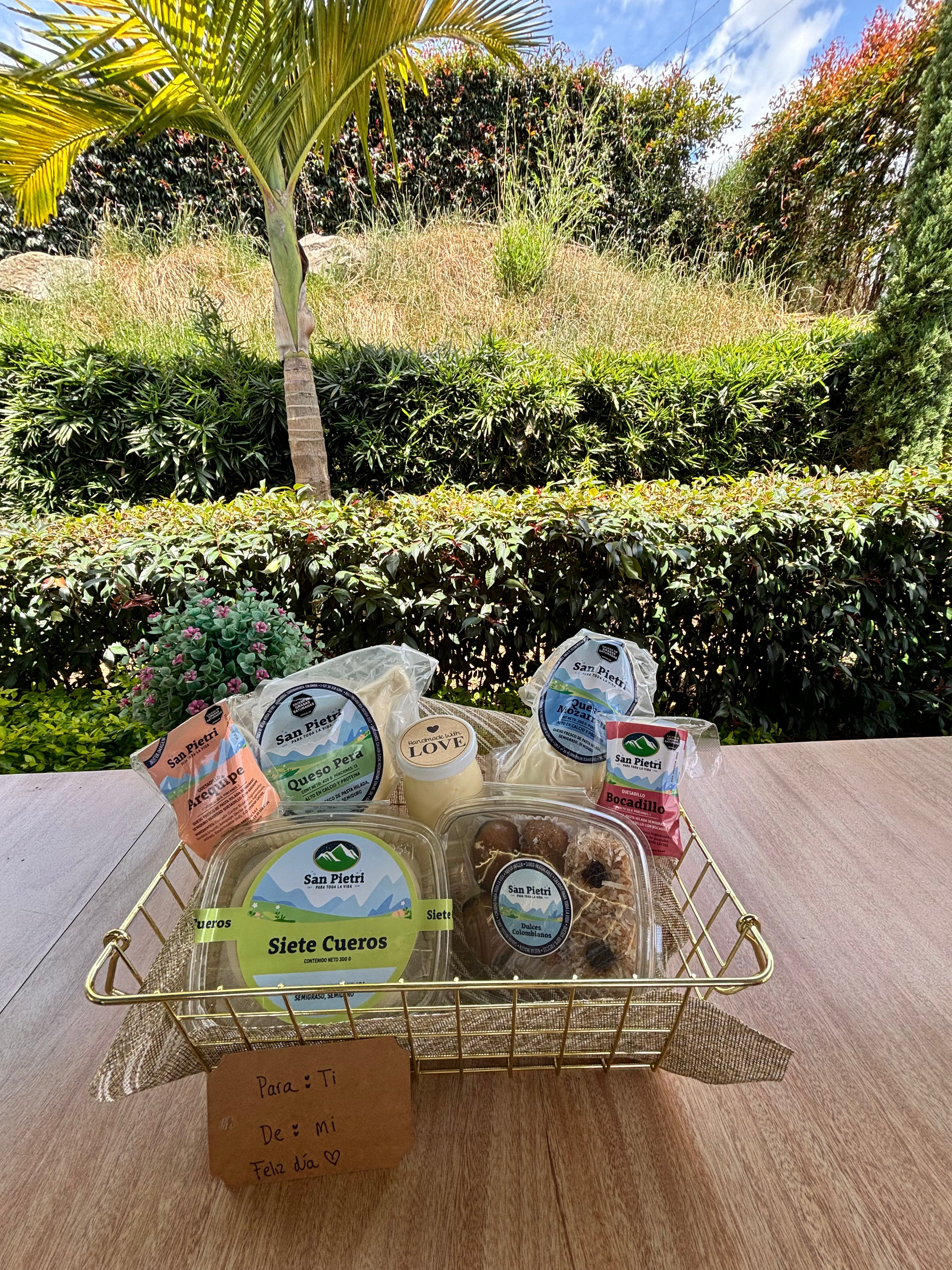 Obsequiale a tu persona favorita la canasta quesera que incluye: 1 Queso Pera de 400g, 1 Queso Mozzarella de 200g, 2 quesadillos de arequipe y bocadillo, 1 Queso 7 Cueros, 1 canasta de dulces típicos (brevas con arequipe, coquitos y arequipe con bocadillo), 1 Yogurt Artesanal San Pietri.